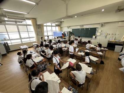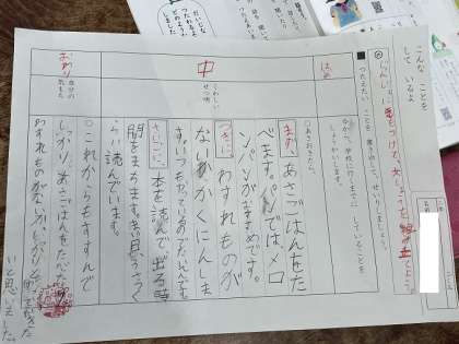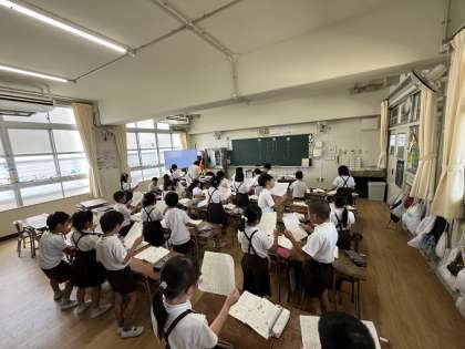 「こんな ことを して いるよ」。つたえたいことを書き出してせいりした原こうをつかって音読で発表をします。今日は、ペアでお互いに聞いてもらってアドバイスをもらっています。