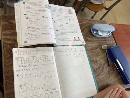 「全体の量を部分と部分の比で分ける方法を考えよう」。全体の量を1とみる方法と、部分と全体の等しい比をつくる方法の2通りの方法で解くことができますね。