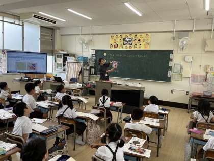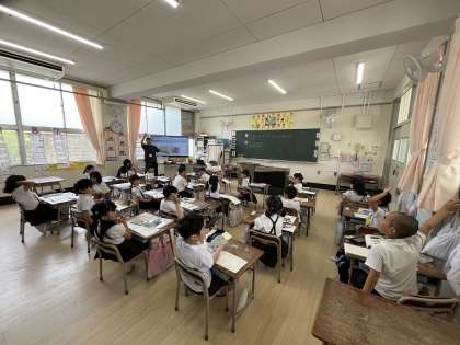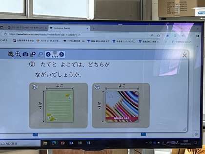 「たてと よこでは、どちらが ながいでしょうか。」。紙テープもつかって、色えんぴつのケースのたてとよこの長さのちがいを比べます。