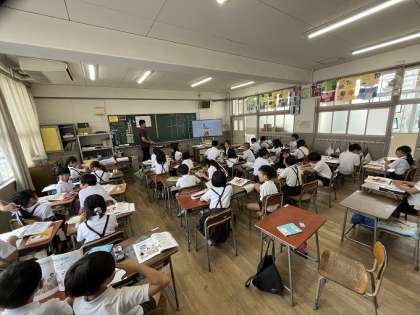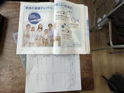 「広告を読み比べよう」。体温計の2つの広告を見比べて、隣の人と相談もしながらちがいを整理してまとめています。