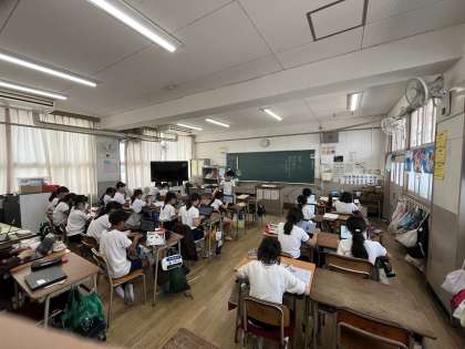 林間学習前の検診が行われていたため、前の黒板に書かれた自習をしています。