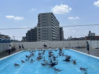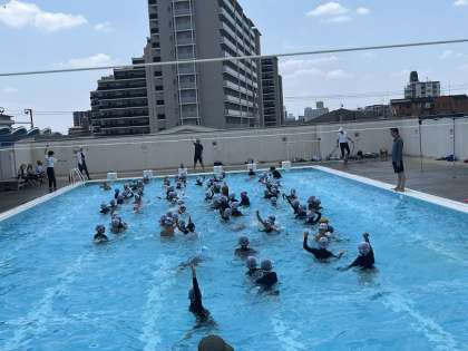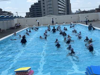プールでの水泳の授業。音楽に合わせて水泳の基本の動きの練習をしています。自分の場所へは、犬かきでもどっています。