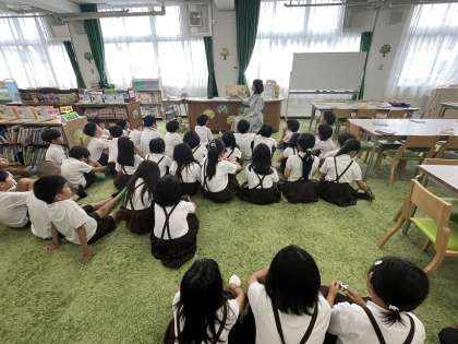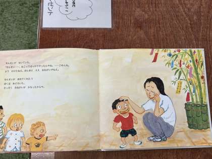図書の時間の最初は読み聞かせ「おこだでませんように」。学校や家でいつも注意されている小学1年生の男の子が、七夕の笹に「おこだでませんように(おこられませんように)」という願いを書いた。するとその願いが〜というホロリとするお話です。