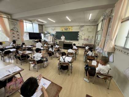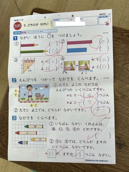 「どちらが ながい」のテストの復習をしています。なぜまちがったかをしることは大切ですね。
