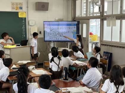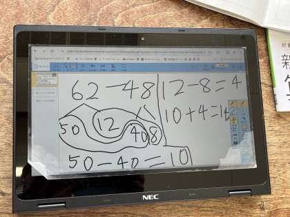 「2けた−2けたの暗算の仕方を考えよう」。それぞれが学習端末に自分の解き方を書いています。当てられた児童は、モニターに映し出された自分の解き方を説明しています。