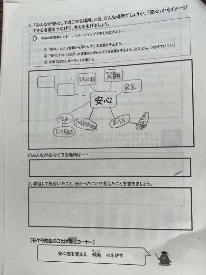 今日は、「みんなが安心して過ごせる場所はどんな場所だろうか」をテーマに児童がつくったイメージマップを使って学習しました。