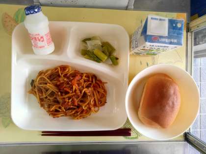 今日の献立は、カレースパゲッティ、グリーンアスパラガスとキャベツのサラダ、発酵乳、ミニコッペパン、牛乳です。