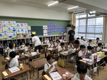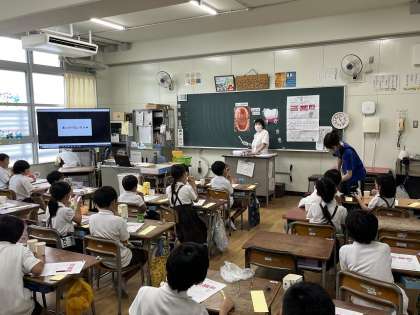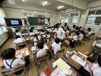 はみがきのコツを教えていただき、ていねいにみがくと、赤くそめたしこうがきれいにとれました。舌でふれると、ざらざらしていた歯がつるつるになっていました。お口のたいそう「あいうべたいそう」「べろべろたいそう」も体験した後、まとめの感想を書きました。