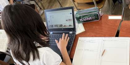 「山場のある物語を書こう」。学習端末で主人公にできそうな海の生き物を調べています。主人公のイメージができたら山場のある文章の組み立てメモをつくります。