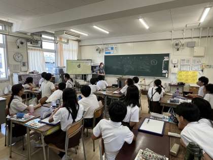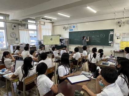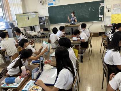 モニターに掲示された図形に隠れている小文字のアルファベットをグループでさがします。C−NETの先生がゲームを進めています。