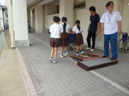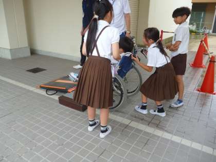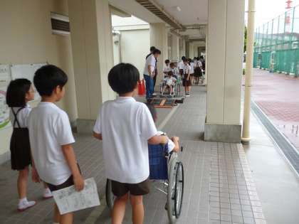 その後、廊下に出て車いすに乗って押してもらったり、友達が乗った車いすを押したりする介助体験をしました。