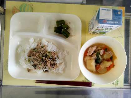 今日の献立は、鶏肉と一口がんもの煮もの、オクラの梅風味、ツナっ葉いため、ごはん、牛乳です。