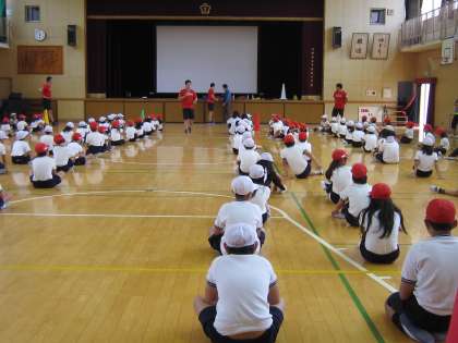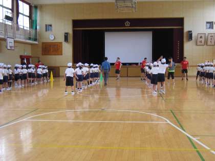 選手の皆さんに、ボールの扱い方を教えていただきながら、パスを使ってのチーム対抗のゲームを実施しました。慣れない手つきでボールと格闘しながら頑張っていました。(5月11日)