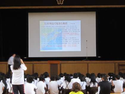 講堂で区役所の方に、災害時の様子について詳しく説明を聞きました。