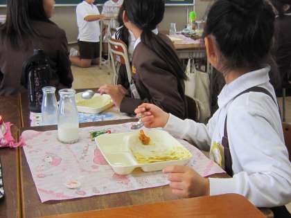 のサラダ、豆こんぶ、牛乳」です。食べ終わってからは、各学級での出し
