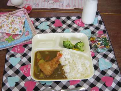 献立のメニューは、「えびフライカレーライス、ブロッコリーとコーン