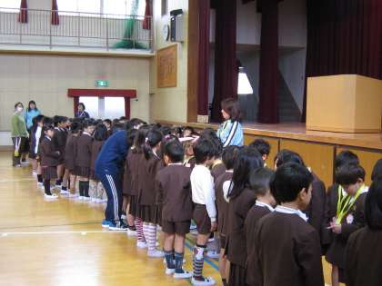 入学してきた1年生と在校生との対面です。在校生からは、メダルと花の種をプレゼントし、互いに仲良くしましょうと声を掛け合いました。