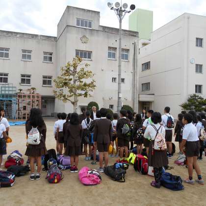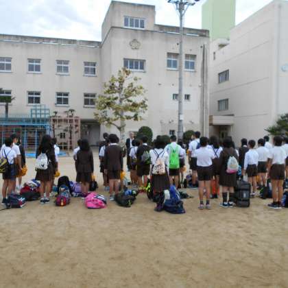 10月4日・5日と修学旅行に行ってきました。グループでの活動を中に、互いに協力して、けがもなく実施することができました。楽しい思い出もたくさん作れたのではないかと思います。(学校の出発式)