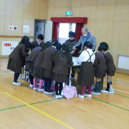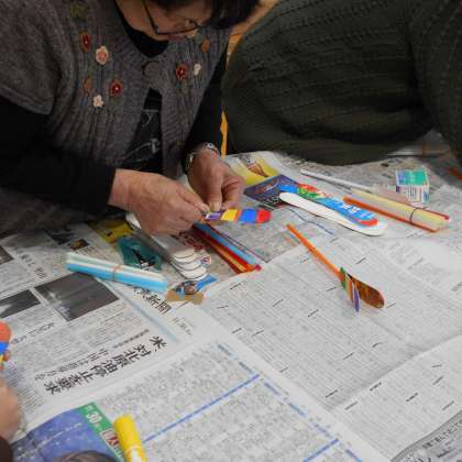 寒さに負けることなく、自分なりのおもちゃを作ろうと取り組んでいました。できあがった作品は、その場で動かしながらよりよく動くようにと工夫をこらしていました。