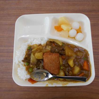 きょうから給食がはじまりました。入学お祝いの献立は、「カツカレーライス」と「フルーツ白玉」です。