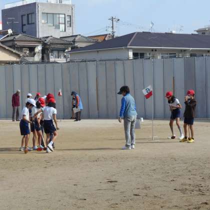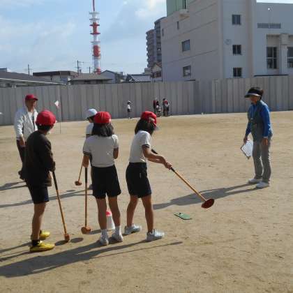 地域の方に来ていただき、グランドゴルフを体験しました。初めてのことで、一打一打に大きな歓声があがっていました。