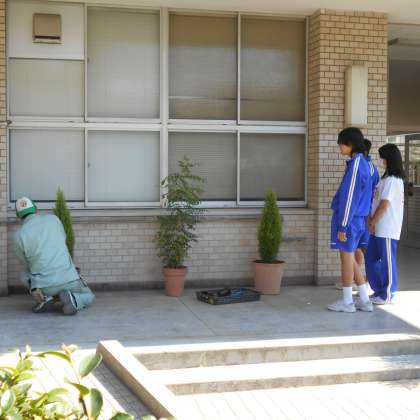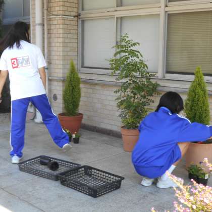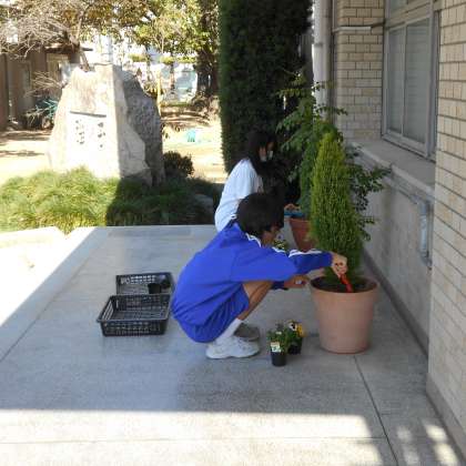 新東淀中学校の生徒たちが、今年も職場体験で、本校にやってきました。みんな卒業生でしたが、小学生の時とは違った目線で学校を見ながら管理作業員さんのお手伝いをしてくれました。玄関や花壇のお花の植え替え等で校内をきれいにしてくれました。