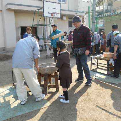 3月2日(土)の土曜授業で、もちつき体験を実施しました。重いきねをもちあげ、懸命にもちをついていました。たくさんの地域の皆さまにおせわになりました。ありがとうございました。