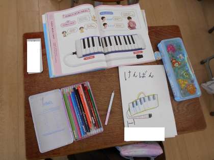 「ドレミ」と鍵盤ハーモニカの授業です。けんばんハーモニカの楽譜などをとじるファイルを作成しています。