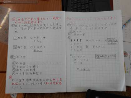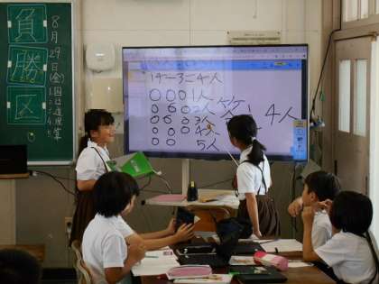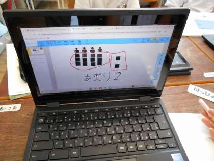 割り切れず余りの出る割り算の勉強しています。各自が自分の考えたことを学習端末にまとめて、発表しています。