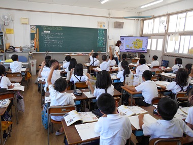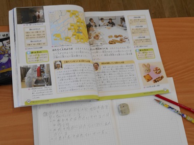 「はたらく人のようす」。大阪市の生野区の工場で働く人がどこに住んでいるか、その理由などを読みとり、隣の人と話し合っています。