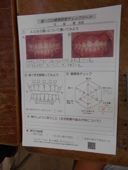 教育委員会から来ていただき、6年生対象に「歯と口の健康教室」を行いました。自然の中のサルの歯と、おかしなどを観光客から与えられたサルの歯を比べて、歯周病の原因となる歯茎のちがいを見つけました。また、チエックシートに自分の歯の状態を書きました。て、