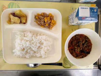 今日の献立は、マーボーなす、ツナと野菜のいためもの、焼きさつまいもの甘みつかけ、ごはん、牛乳です。