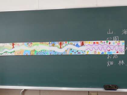 水彩絵の具で塗って乾いた後、クレパスで絵をかいていました。とてもきれいに見えました。