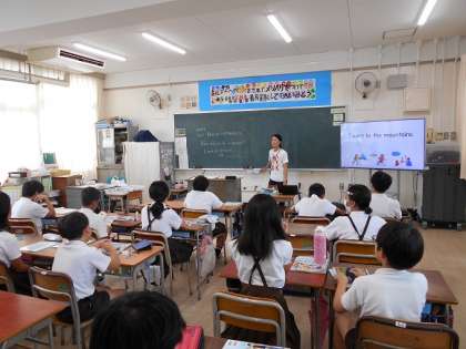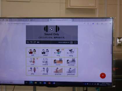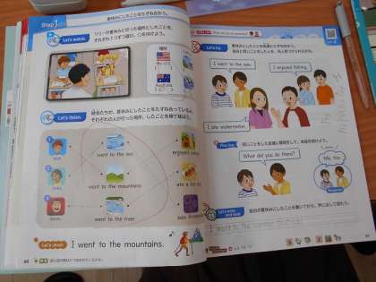 単語の練習の後、夏休みにしたことを英語で書いています。この後、ペアで会話をします。