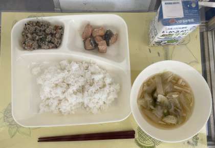 今日の献立は、さけのしょうゆだれかけ、五目汁、高野どうふのいり煮、ごはん、牛乳です。