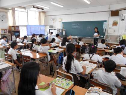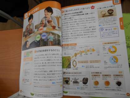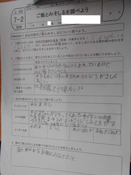 「食べて元気に」。家でのごはんとみそ汁について振り返りながら学習しています。