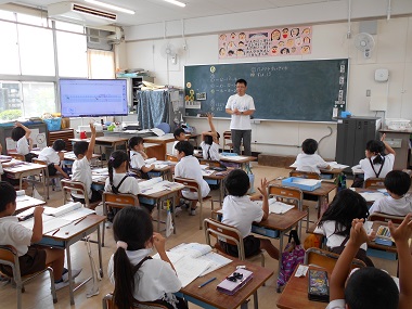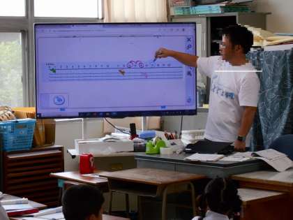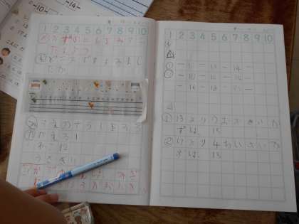 「かずのせんをみてかんがえよう」。数直線に書かれた点を読んで、数を見つけています。