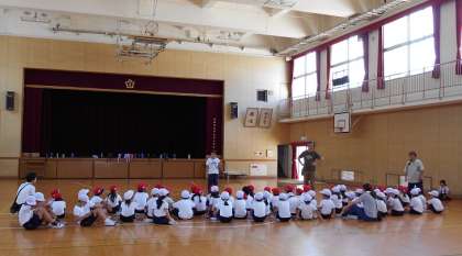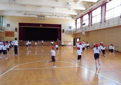 1・2組合同での体育です。赤白組に分かれて、鬼ごっこをしています。
