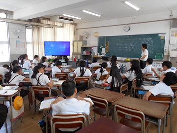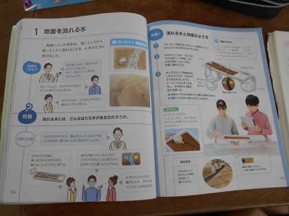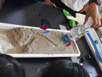 「地面を流れる水」。教室で学習した後、理科室に移動し、水の流れによって、流れ沿いの土が削られる様子を観察しました。