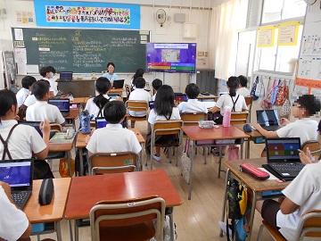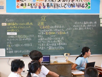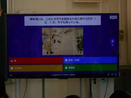 「元寇」の学習です。「Kahoot!(カフート)」というアプリと学習案末を使って、習ったことをクイズ形式で復習しています。