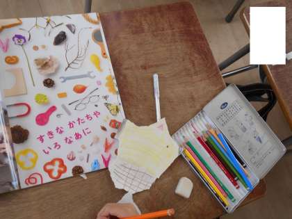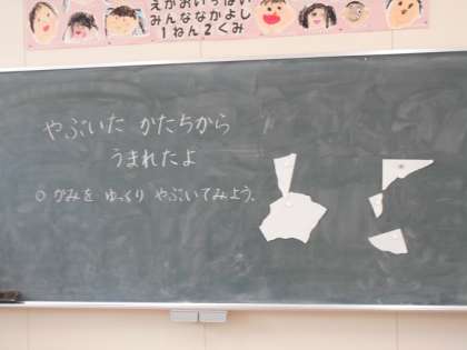「やぶいた かたちから うまれたよ」。紙をゆっくりやぶいて、やぶいたかたちを使って作品をつくっています。