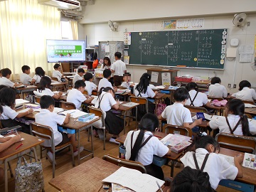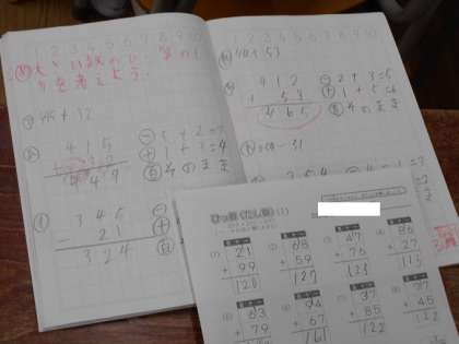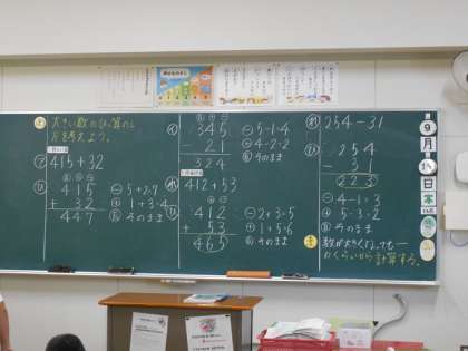 「大きい数のひっ算のし方を考えよう」。筆算を使った計算のやり方を練習しています。