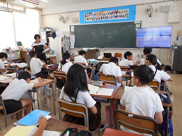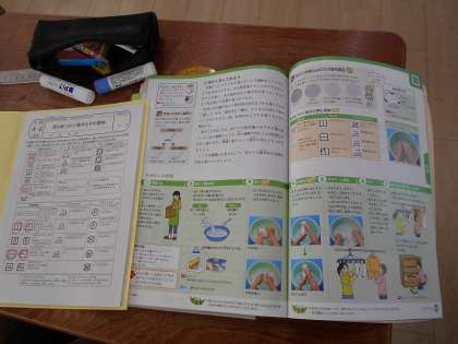 「取りあつかい表示とその意味」。衣服についている洗たくやアイロンについての注意表示の意味について学習しています。