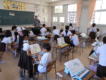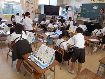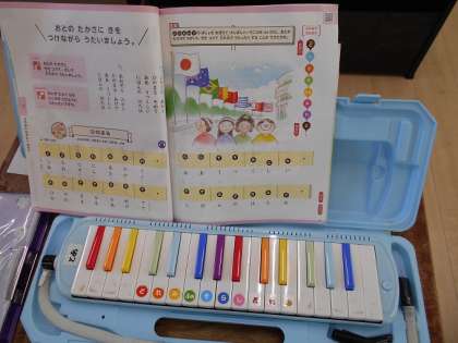 「おとの たかさに きをつけて うたいましょう」。ペアになって、けんばんハーモニカの練習をしています。