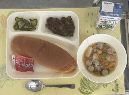 今日の献立は、牛肉のデミグラスソース煮、ウインナーのスープ煮、きゅうりのピクルス、コッペパン、牛乳、いちごジャムです。
