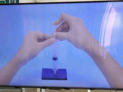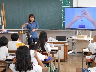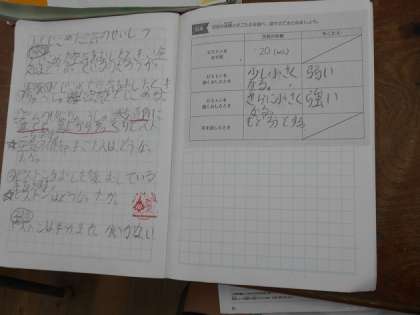 「とじこめた空気のせいしつ」。ピストンで押し込めた空気の体積と手ごたえを実験で調べて、まとめをしています。