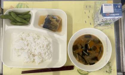 今日の献立は、さごしのみぞれかけ、かぼちゃのみそ汁、えだまめ、ごはん、牛乳です。
