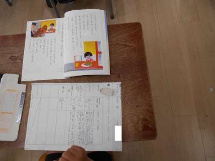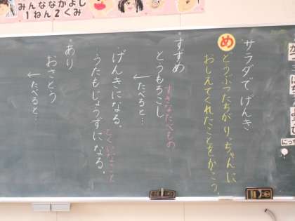 「サラダでげんき」。「どうぶつたちがりっちゃんにおしえてくれたことをかこう」ノートにまとめています。