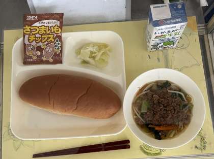 今日の献立は、タンタンめん(汁めん・肉みそ)、キャベツの甘酢づけ、おさつチップス、黒糖パン、牛乳です。