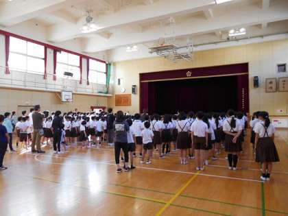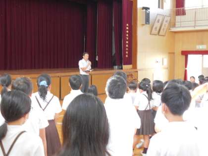 今日は講堂で行いました。校長先生から今週の6年修学旅行、中秋の名月(本日)、下新庄地域ふれあい敬老大会についてお話がありました。敬老大会では、生涯学習のコーラス、新東淀中学校吹奏楽部の演奏などがありました。地域のお年寄りの方は下新庄小学校の児童のことを大切に思っておられます。見守り活動などお世話になっている地域のお年寄りの方へ、いつも感謝の気持ちをもって接してください。
